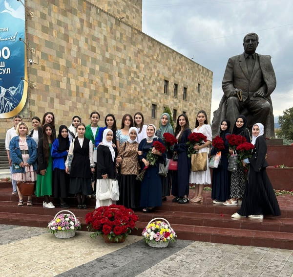 Алиева Т.М. , Джаватова Г.А. , Казамбиева М.М. со студентами колледжа возложили цветы к памятнику Расула Гамзатова ,а так же у памятника были зачитаны стихи в честь дня рождения поэта .