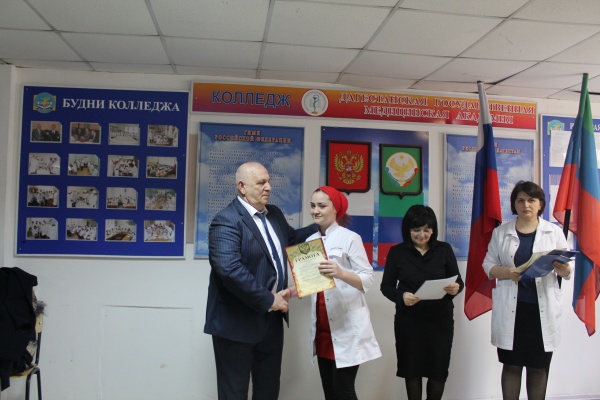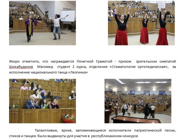 11 марта 2016 года в биологическом корпусе ДГМА состоялся первый смотр — конкурс художественной самодеятельности Медицинского колледжа, в котором приняли активное участие все курсы и отделения. Конкурс проводился в целях формирования условий для гражданского становления, патриотического и духовно-нравственного воспитания молодого поколения. Мероприятие открыл Проректор по учебной работе, избранный ректор ДГМА профессор Маммаев Сулейман Нураттинович, который приветствуя участников и гостей сказал: «Мне очень приятно сегодня приветствовать активную молодежь медицинского колледжа Дагестанской государственной медицинской академии. Это та часть молодежи, которая всегда в поиске; в поиске новых, активных форм организации досуга студенческой молодежи; это студенты, которые принимают активное участие в организации и проведении мероприятий в самом колледже и Академии. Медицинская академия всегда имела особую духовную миссию — она была центром культуры, центром воспитания нравственности, толерантности. В стенах нашего учебного заведения бурлит богатая студенческая жизнь. Студентам академии и колледжа созданы благоприятные условия не только для обучения, но и для раскрытия и развития творческих талантов и способностей. Последние годы руководство медицинского колледжа во главе с директором сделали многое не только для учебы и образовательной деятельности, но и для того чтобы была достаточно активная внеаудиторная студенческая деятельность». Маммаев С.Н. пожелал всем присутствующим силы духа, успехов во всех начинаниях и хорошего вечера. Гостями вечера были народные артисты республики Дагестан Аббасов Махач Магомедович и Тамара Абдулаева.