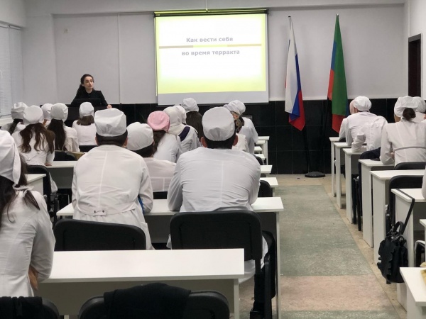 Накануне кураторы групп Медицинского колледжа ДГМУ совместно с администрацией колледжа провели беседы на тему "Мы против террора", посвященные трагическим событиям в г.Керчь., продемонстрировали презентации с ознакомлением техники безопасности, а также с правилами поведения в ситуациях, связанных с терроризмом,