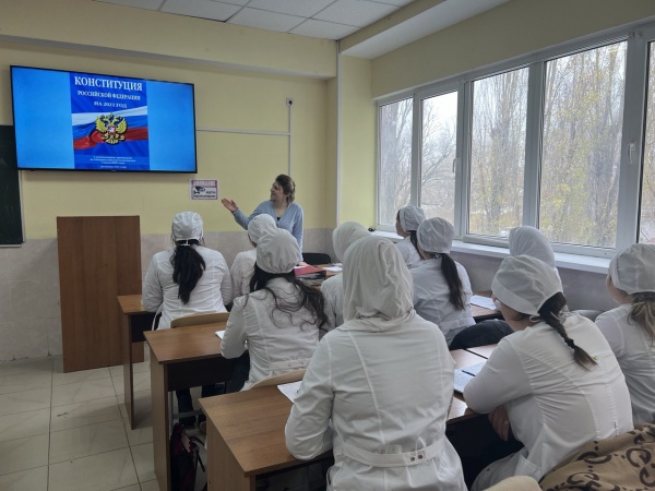 11 декабря 2023 г. в Медицинском колледже ДГМУ в рамках проекта «Разговоры о важном» были проведены кураторские  часы на тему «Главный закон страны».  Цель занятия: актуализация знаний об Основном законе страны; формирование представлений о важности Конституции в жизни гражданина; воспитание чувства гражданского долга и ответственности