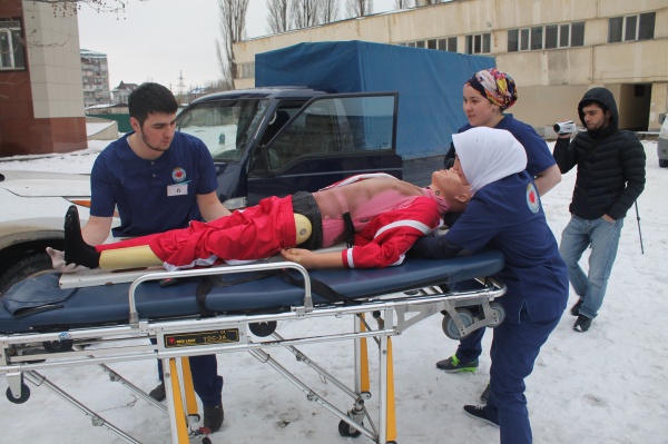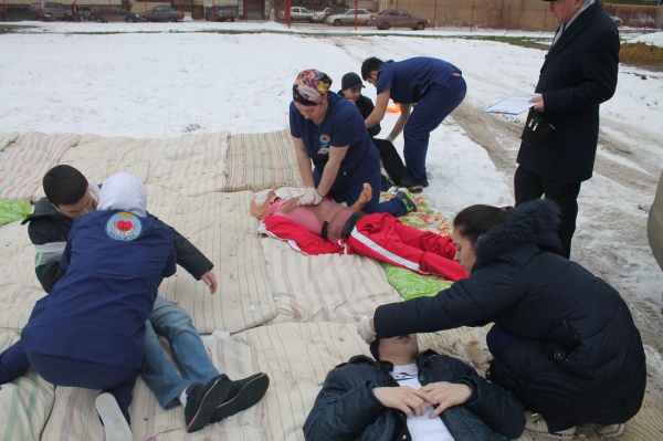 Третий этап проходил во дворе ДГМУ. Оценивалась работа команды в оказании первой помощи в дорожно-транспортных происшествиях.