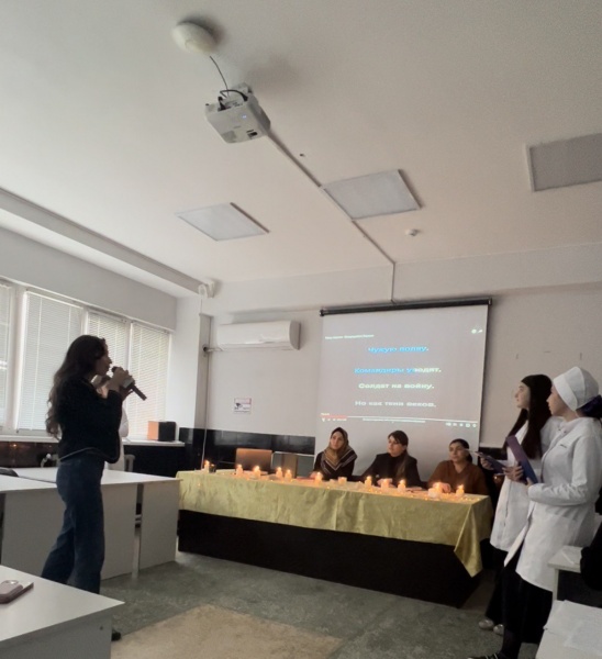 В состоявшемся мероприятии приняли участие студенты 1 курса специальности- «Акушерское дело», выступив с докладами и стихами. И студенты продемонстрировали портреты погибших во время Специальной Военной Операции героев.