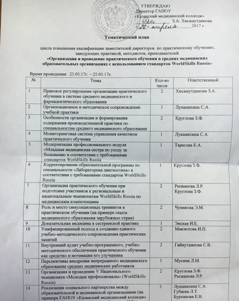 Тематический план "Организация и проведение практического обучения в средних медицинских образовательных организациях с использованием стандартов WorldSkills Russia