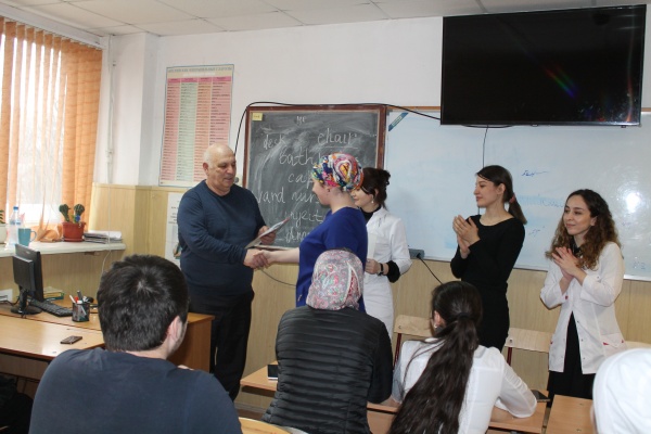 Директор поздравляет со вторым местом Дахадаеву Айшат, студентку 2 курса отделения "Сестринское дело"