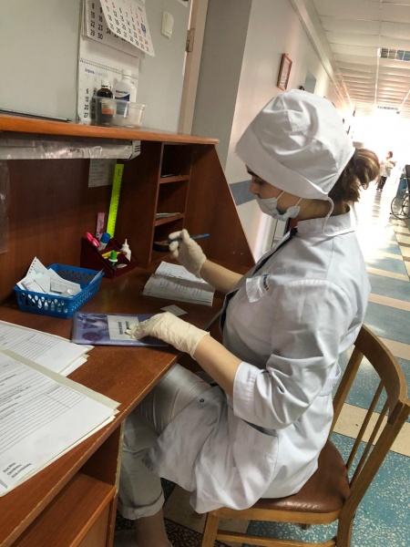 Шахмирова Заира 4 курс 6 группа сестринское отделение. Проходит преддипломную практику в ГБУ РД «НКО» «ДЦГХ». Работает с медицинской документацией и выписывает направления на сдачу анализов.