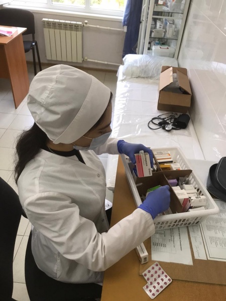 Гаджиева Диана Гаджиевна 4 курс 6 группа сестринское отделение. Проходит практику в ГБУ РД "РНД". Занимается раскладкой лекарственных препаратов.