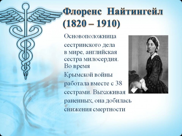 Ежегодно 12 мая отмечается Международный день медицинской сестры (International Nurses Day). Другими словами, сегодня есть повод еще раз поблагодарить и поздравить представительниц одной из самых гуманных профессий. Медицинские сестры — это специалисты, получившие начальное медицинское образование и выполняющие предписания врача или фельдшера по уходу за больными, это обязательные помощники докторов, ведь именно они на протяжение всего срока лечения непосредственно работают с пациентом. В настоящее время медицинские сестры составляют самую многочисленную категорию работников здравоохранения, так как во врачебной практике большая доля медицинских услуг оказывается исключительно сестринским персоналом. Профессиональный праздник медицинских сестер отмечается в день рождения одной из знаменитых англичанок, Флоренс Найтингейл (Florence Nightingale), которая во время Крымской войны (1853—1856) организовала первую в мире службу сестер милосердия.