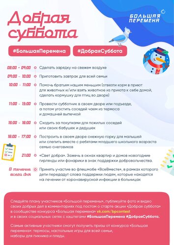 22 января 2021 года в сообществе Всероссийского конкурса для школьников «Большая перемена» социальной сети ВКонтакте (https://vk.com/bpcontest) стартует Всероссийская акция «Добрая суббота». Инициаторами акции выступили участники «Большой перемены», они предложили всем школьникам и их родителям начать новый год с добрых дел и полезных привычек.